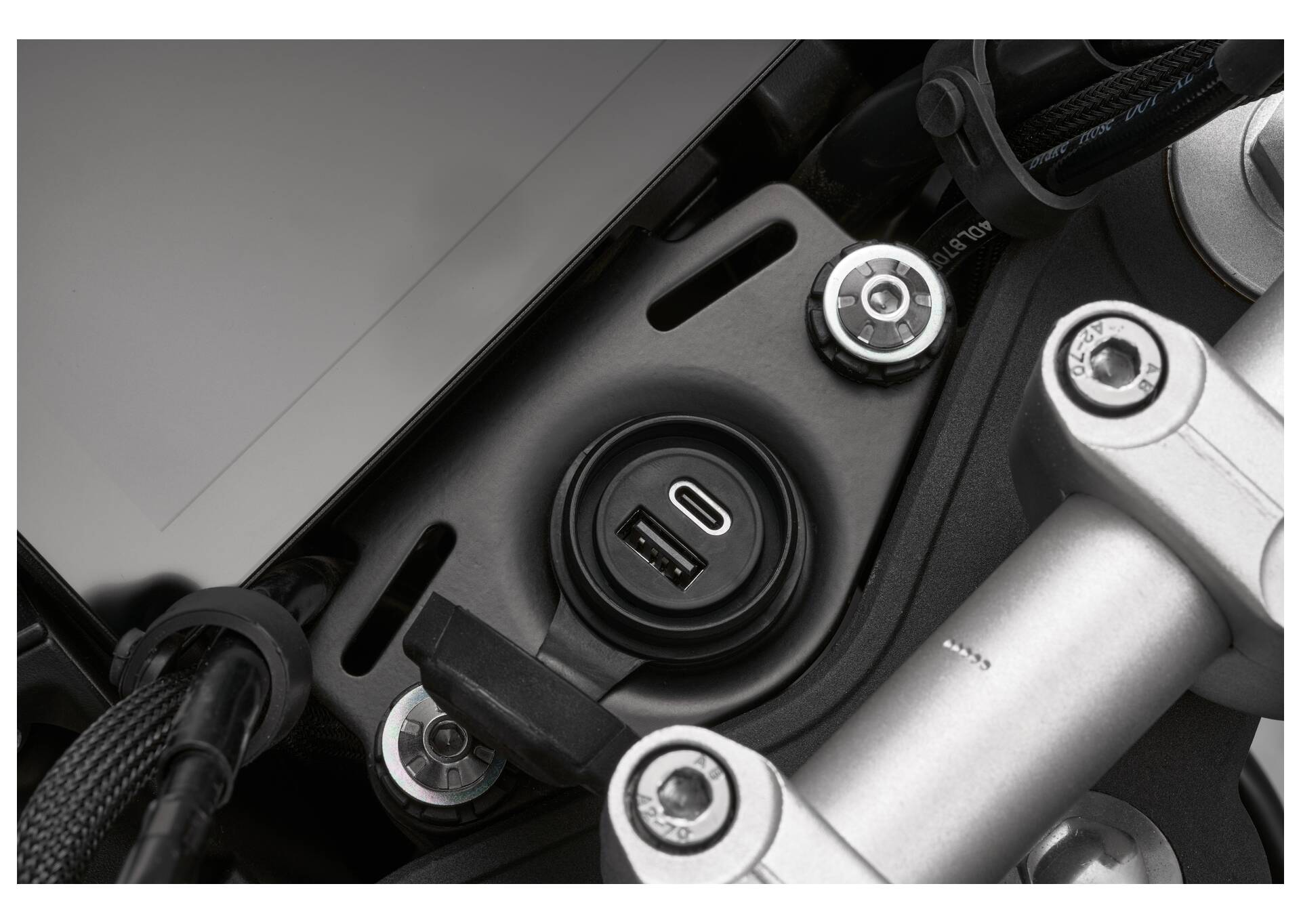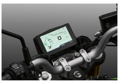 7″ TFT-näidikupaneel kuvab selgelt kogu vajaliku sõiduinfo ning toetab nii navigeerimist kui ka telefoniekraani peegeldamist; lisaks on olemas USB-C ja USB-A laadimispesad.